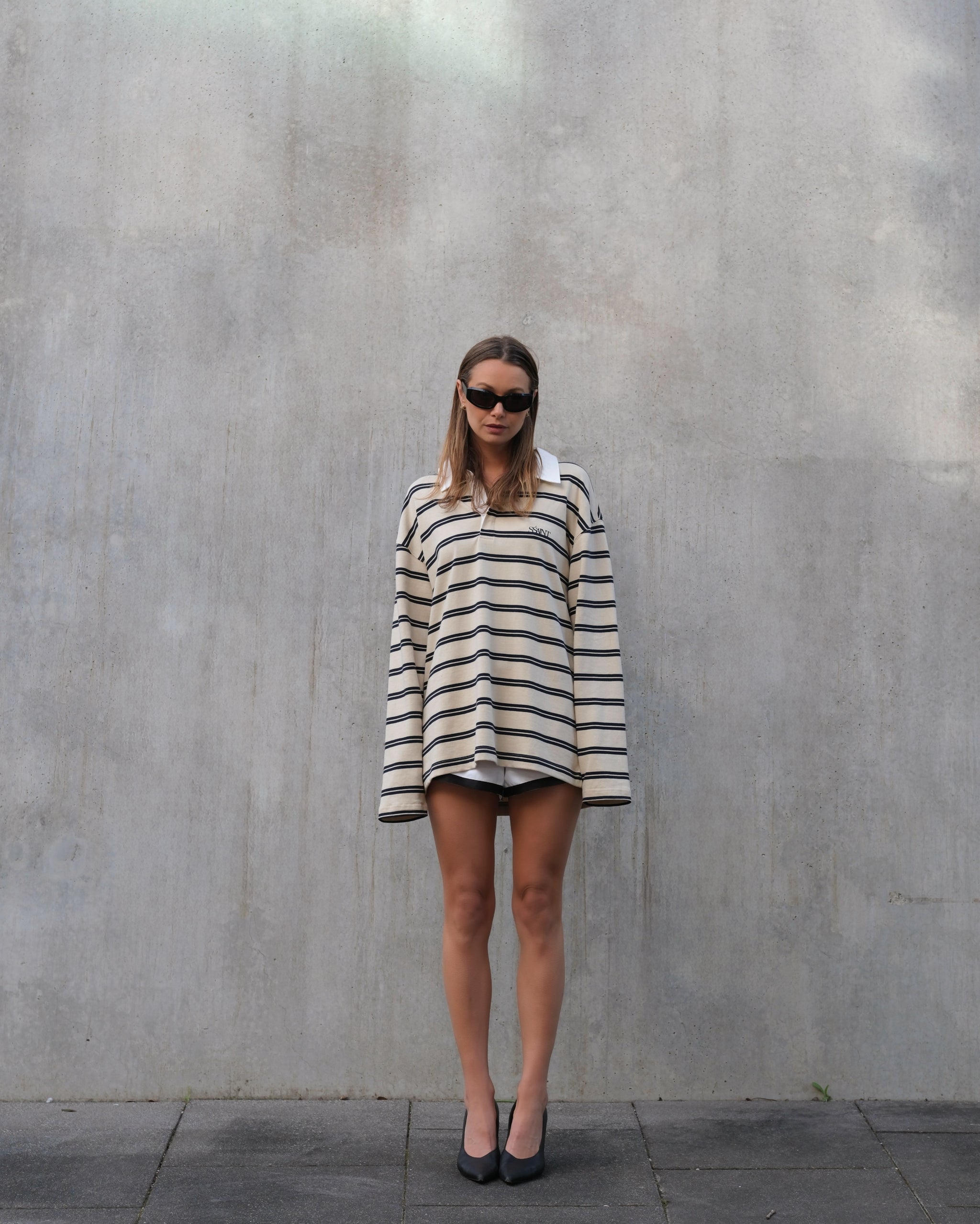 Introducing the Ryder Rugby Polo, a unisex staple that blends classic style with modern details. Featuring bold cream and navy stripes, it’s crafted from 100% cotton for comfort and durability. Finished with a crisp white collar and the signature embroidered SŚAINT logo, it delivers a sporty yet polished look.